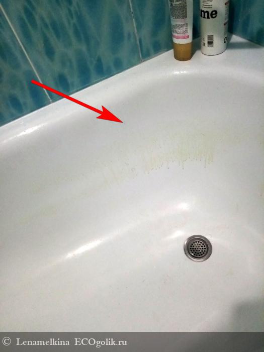 Следы после эссенции остаются лишь на стенках ванны. Но и то я считаю их незначительными. Это небольшие потёки, которые легко смываются под горячей струей из душа. После процедуры я вообще даже не заморачиваюсь с мытьём ванны. После меня муж сразу идёт принимать душ, и под струями горячей воды все остатки эссенции окончательно смываются со стенок ванны (так что ароматерапия перепадает ещё и мужу)