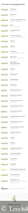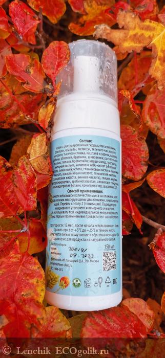 Купаж структурированных гидролатов земляники, ромашки, крапивы, мелиссы, зеленого чая, кипрея; экстракты тысячелистника, каштана и сирени, калины, рябины, облепихи, брусники, шиповника; растительные энзимы: папаин, бромелайн, ниацинамид, трегалоза, янтарная кислота, комплекс AHA-кислот (яблочная кислота, лимонная кислота, глюконовая кислота, молочная кислота, аскорбиновая кислота, гликолевая кислота, салициловая кислота, винная кислота), глицин, инулин, дигидрокверцетин, арабиногалактан, аллантоин, глицерин, кокамидопропил бетаин, кокоглюкозид, шаромикс 721.