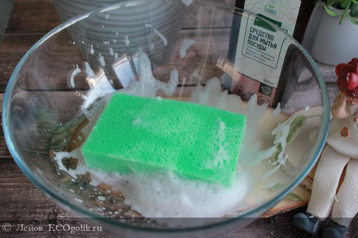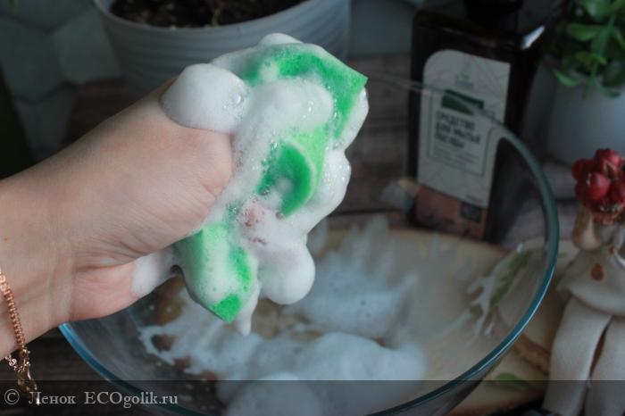 Гель шикарно пенится, такой пены хватает на большое количество посуды, но!!! Производитель предлагает замачивать посуду в воде с гелем добавляя его согласно инструкции, для минимизации потребления воды и энергии, а так же загрязнения воды. С одной стороны экономно во всех планах, с другой, у нас столько посуды , что замачивать только в ванне, по этому я мою классическим все таки способом.