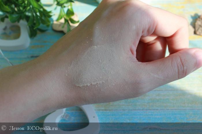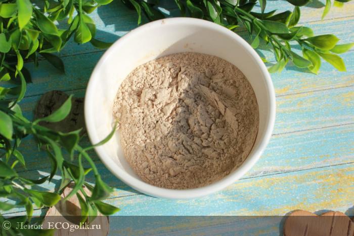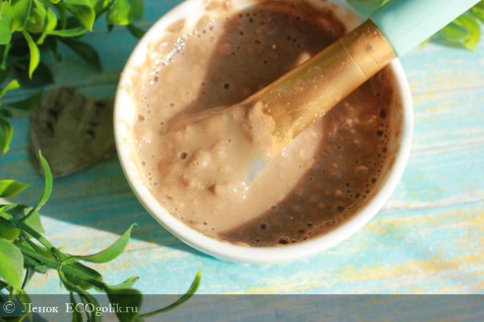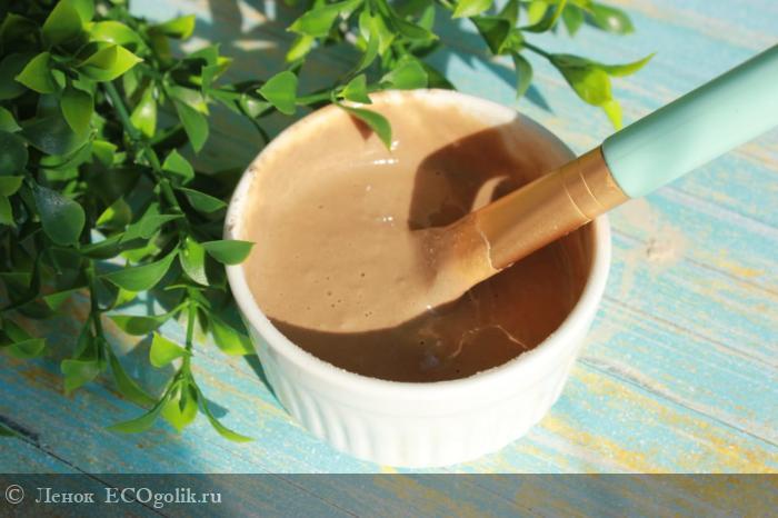 В неразведенном виде маска светло бежевого цвета, аромат едва уловим, помол очень мелкий, без каких либо вкраплений.