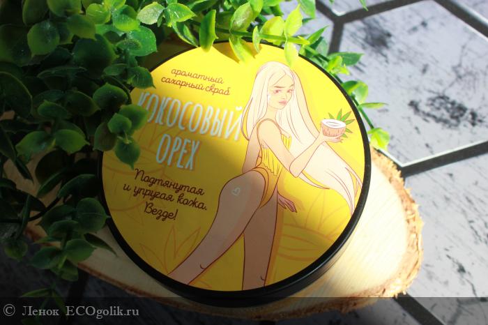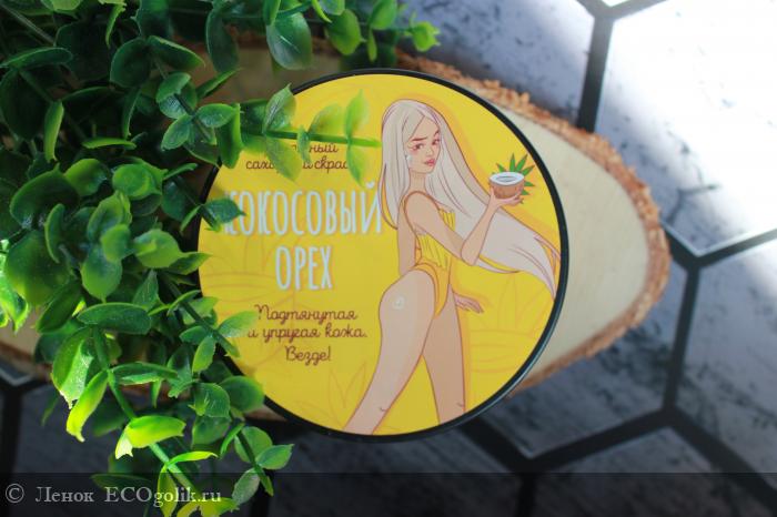 Скраб находится в баночке шайбе из прочного пластика, позитивное оформление и как всегда оригинальное название, точно обратят на себя внимание покупателя.