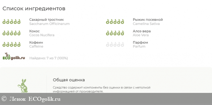 В качестве скрабирующих частичек в продукте выступает Тростниковый сахар, Масла кокоса и алоэ-вера питают и увлажняют кожу, а Кофеин дренирует ткани и стимулирует обменные процессы в клетках