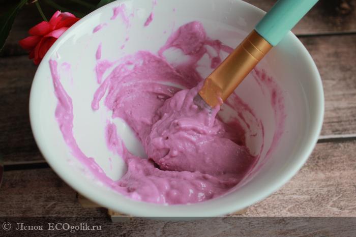 При приготовлении маски решила все таки доверится способу который рекомендует бренд. Кстати Smorodina первый бренд который советует добавить именно холодную воду. При разведении раствор становится ярко розового цвета, не обычно. Но вот советуемых 10 ложек мне не хватило, опять пришлось доливать на глаз чтобы получить нужную консистенцию.