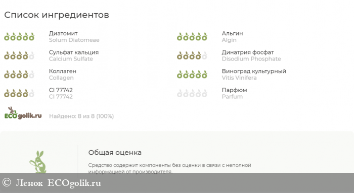 И с составом происходят какие то странности, основные ингредиенты указанные и на сайте и на упаковке Диатомит, альгинаты водорослей, сульфат кальция, динатрия фосфат, вытяжка из косточек красного винограда, а вот дальше немного интересно в версии INCI на упаковке добавляется Краситель и ароматизатор, а в версии на сайте еще и Коллаген.. где тут правда не разобрать, но хотя бы все эти ингредиенты одобрены порталом, кроме ароматизатора.