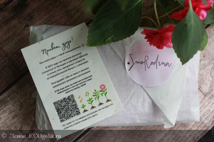 А еще хочется рассказать немного об оформлении самой посылки, так как это заслуживает отдельного внимания. Cогласитесь приятно получать посылку оформленную с душой, а мне кажется у Smorodina именно так. Пакетики с масками заботливо обернутые в упаковочную бумагу тишью и скреплённые наклейкой с логотипом. А какая открытка!!! Открытка сделана из переработанной бумаги, да еще и с семенами, эту открытку можно посадить в землю и вырастут цветы. Ну разве не круто? Такое честно признаться я вижу впервые
