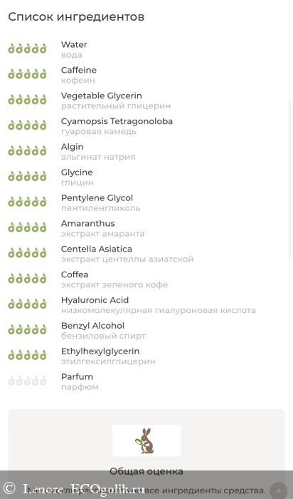 вода Мацеста, гидролат черной смородины, кофеин, растительный глицерин, гуаровая камедь, альгинат натрия, глицин, пальмитоилтрипептид-38 (инновационный пептид), пентиленгликоль, SC-CO2 экстракт амаранта, SC-CO2 экстракт центеллы азиатской, SC-CO2 экстракт зеленого кофе, низкомолекулярная гиалуроновая кислота, бензиловый спирт, этилгексилглицерин, парфюм
