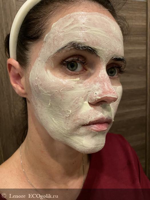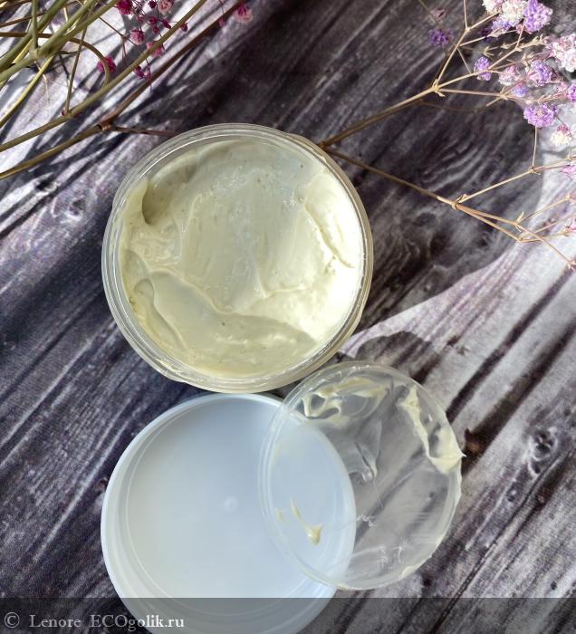 Сам продукт — густая, кремообразная масса. Консистенция напоминает плотный йогурт или мягкую глину: легко набирается, не капает, равномерно распределяется. При нанесении ощущается лёгкое охлаждение, но без пощипывания — приятно и спокойно.