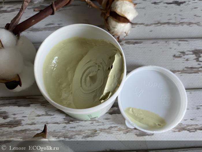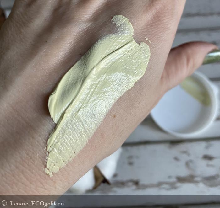 Консистенция очень нежная и густая, глина очень тонкого помола, кремообразная паста легко зацепляется пальцами (а лучше шпателем) и ложится на кожу.