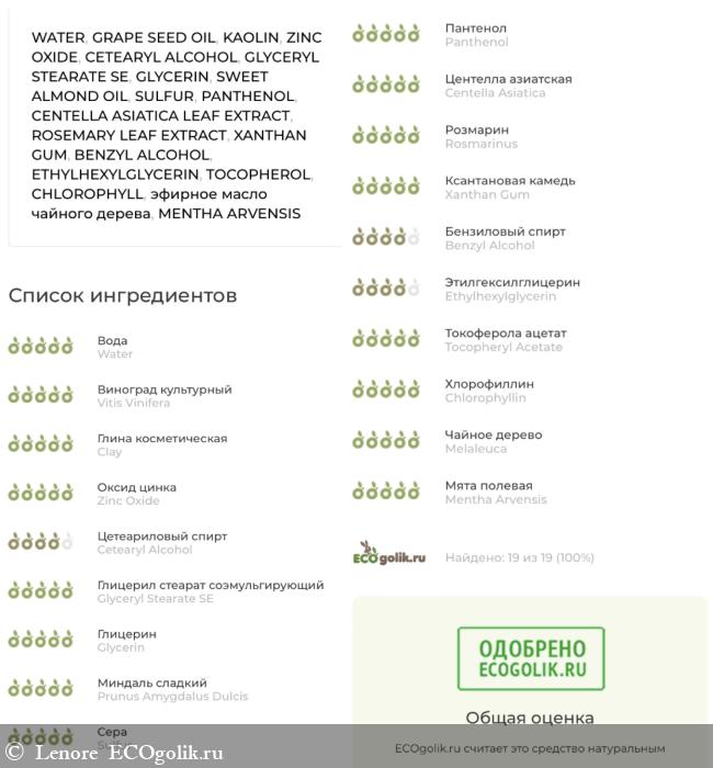 В составе маски кроме глины находятся мощные противоспалительные ингредиенты такие как экстракт центеллы азиатской и эфирное масло чайного дерева. Глина и сера тоже эффективны против прыщей. Я заметила эффективность маски в этом направлении.