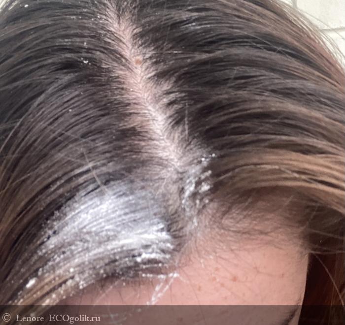 У меня были опасения, что для брюнеток белый порошок не подходит так, как для блондинок. Но оказалось суть в том, что насыпав порошок по проборам на волосы, нужно очень хорошо расчесать и вытрясти его с волос, порошок впитает всю грязь и ссыпется, оставив голову визуально чистой.
