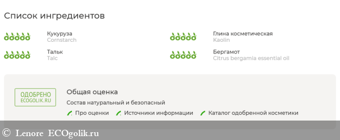 Состав очень простой и эффективный: первые три компонента впитывают жир, а бергамот свежий ароматизатор. Кстати, им почти не пахнет.