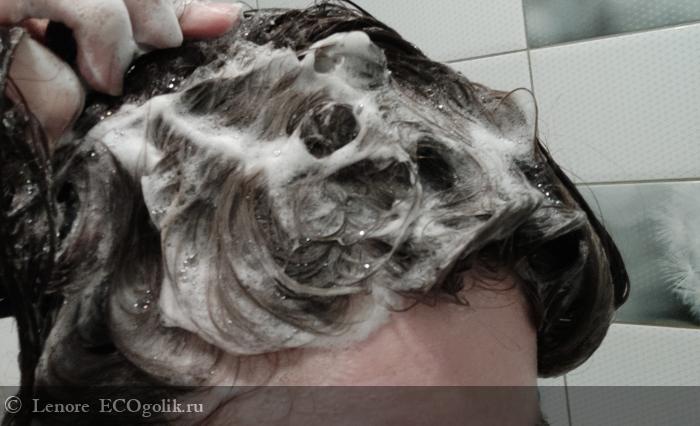Его лучше всего сперва вспенить в ладонях и только после наносить на волосы.
