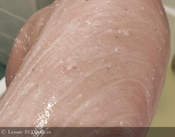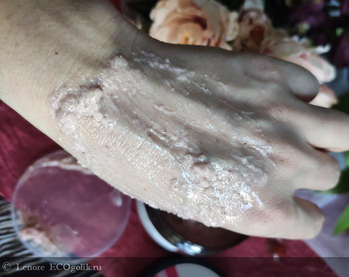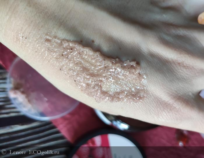 Легко зачерпывается из банки рукой, наносится отлично, самое главное что при распределении скраб не осыпается, хотя он совершенно не масляный.