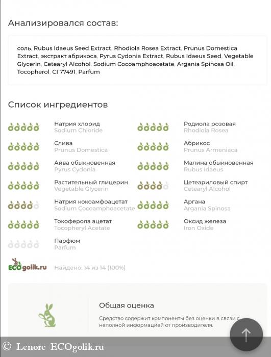 В качестве скрабирующих частиц тут использована соль мертвого моря и семена малины, так же скраб богат на различные экстракты, имеется витамин Е и аргановое масло. В качестве красителя оксид железа.