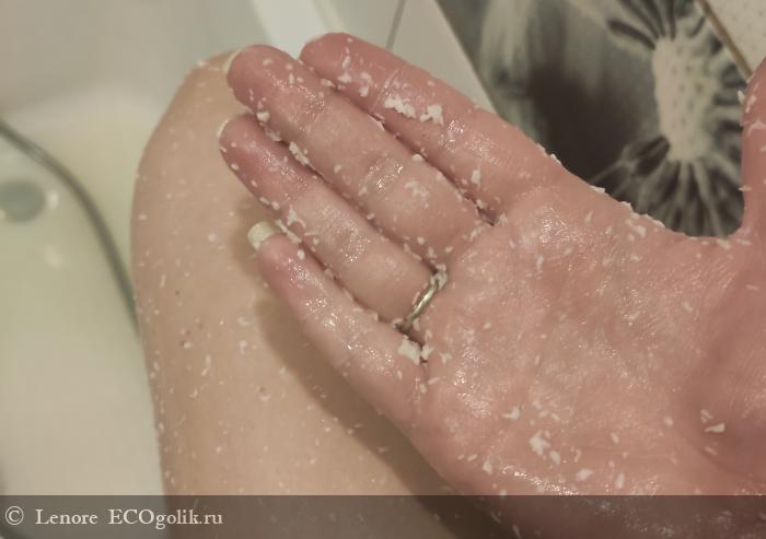 При нанесении на уже распаренную после ванны, но высушенную кожу присходит практически тоже самое, что в первом случае, только качество кожи мне нравится больше, как будто набравшая влаги кожа под воздействием масел становится более напитанной, эффекта скрабирования нет