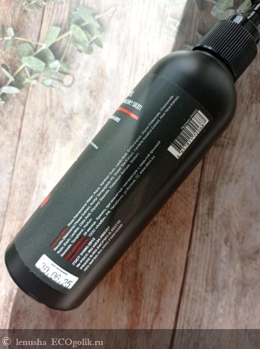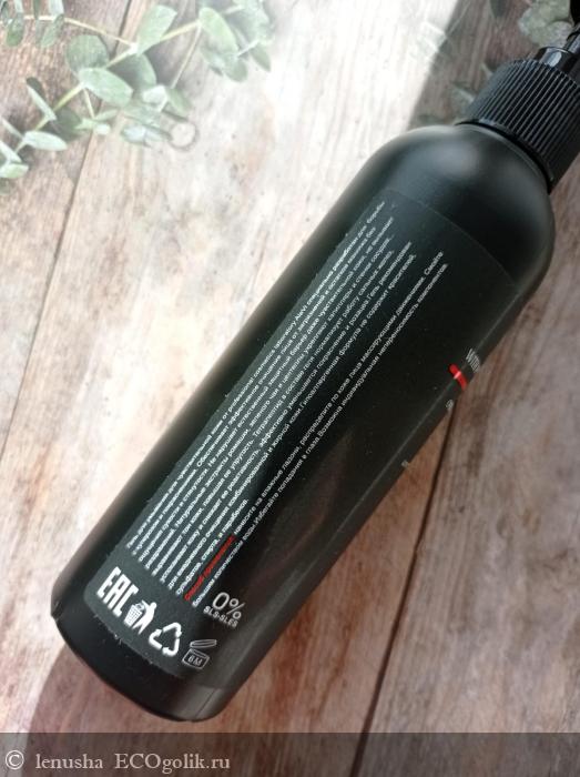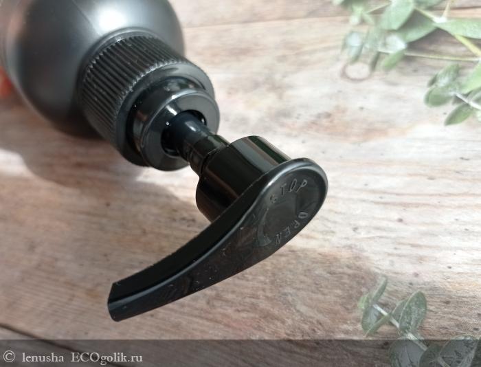 Флакон из черного пластика с поворотным дозатором. На круговой наклейке содержится подробная информация о средстве.