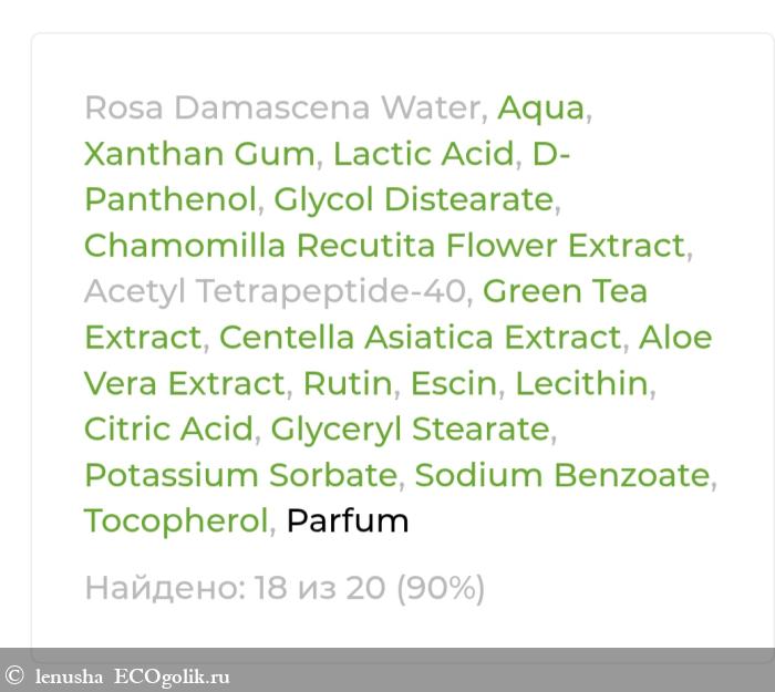 • Натуральные экстракты ромашки, зелëного чая и центеллы укрепляют капилляры и стенки сосудов, выравнивают тон коди, повышают еë упругость.