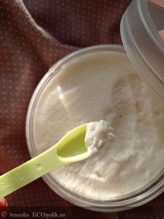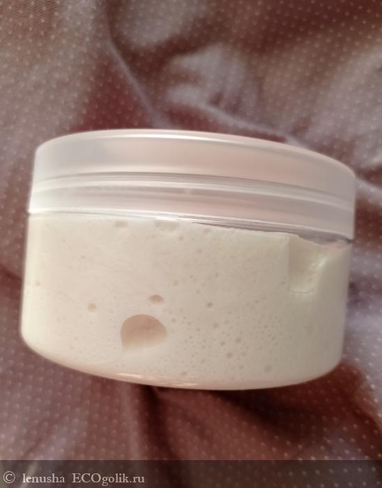 Парфе молочного цвета, обладает взбитой текстурой. Она очень нежная и воздушная , легко набирается шпателем из баночки.