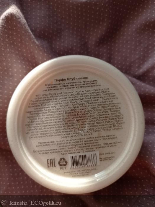 Маска обладает очень приятным ароматом клубники, он не химозный и ненавязчивый, не приторный. На волосах не остается.