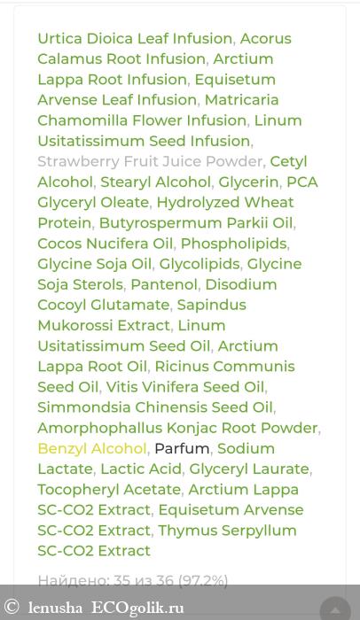 Содержит биолипидный комплекс, протеины, сок клубники , масла и активные экстракты для витаминного питания и укрепления волос.