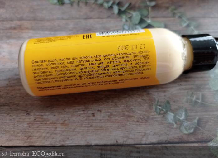Крем светло - жёлтого оттенка. Такой солнечный цвет ему придаёт масло облепихи, входящее в его состав.