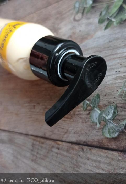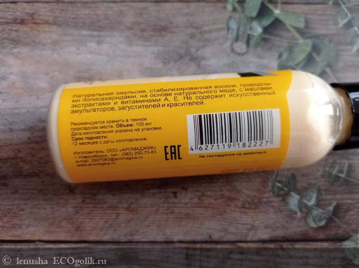 Молочко находится в пластиковом флаконе с поворотным дозатором. На круговой наклейке есть вся необходимая информация.