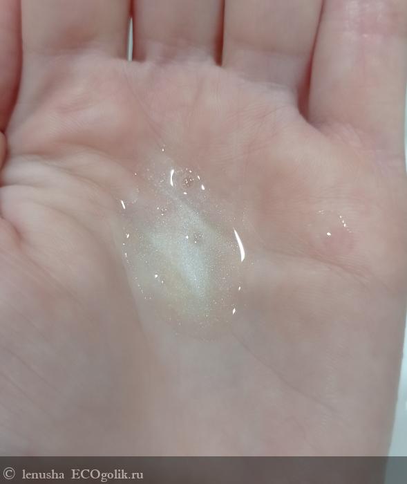Шампунь молочного цвета, перламутровый. Текстура у него гелевая, жидкая.