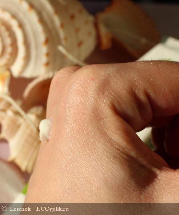 Если смотреть в просвет тюбика, то крем выглядит чуть зеленоватым, думаю это влияние экстракта водоросли и масла авокадо. Снаружи порция не белоснежная, но не имеет явного оттенка.