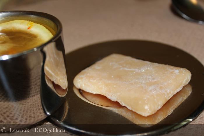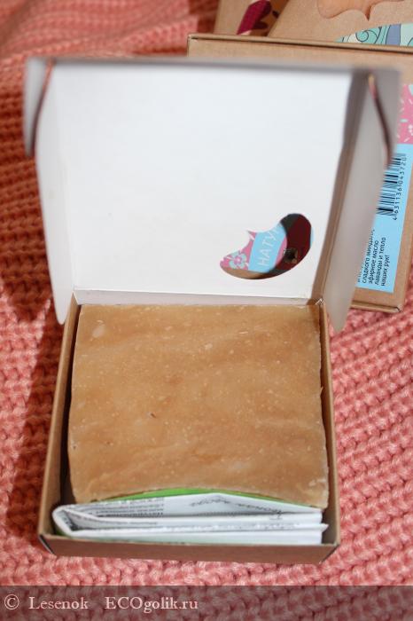 Тактильно гладкий, брусочек мыла богат цветовыми переходами от медвяно-желтого до карамели со сливочным вкраплениями.