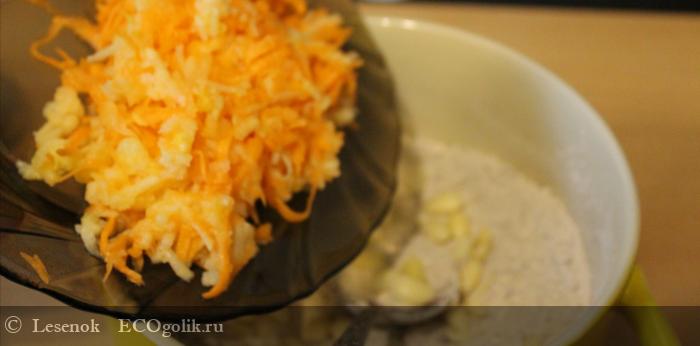 Яблоко с морковью перетерла на средней тёрке и добавила в тесто горсть очищенных абрикосовых зёрнышек.