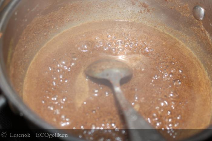 Довожу до кипения и засыпаю обжаренный кэроб в количестве примерно трети пачки. Главное, чтобы цвет и консистенция напоминали горячий шоколад.