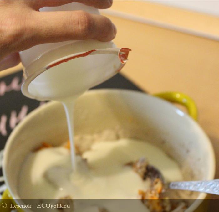 Заливаю все стаканом питьевого йогурта и перемешиваю.