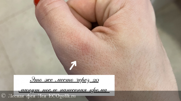 Через 20 минут от красного пятнышка почти ничего не осталось. А самое главное, прошло нестерпимое чувство жжения, стягивания и зуда (фото ниже):