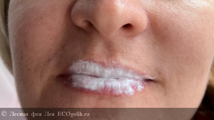 Ещё как-то в соц.сетях бренда (Мастерская Олеси Мустаевой) я подсмотрела такой секретик: маска из крема под подгузник на губах быстро приводит их в чувство, снимает сухость и «обветренность» губ на ура. И, поэтому, раз в неделю я делаю на 10 минут маску на губы из крема под подгузник, как на фото ниже: