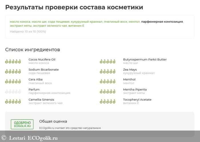 Состав включает небольшой список компонентов, все натурального происхождения, что подтверждено сайтом Экоголик.