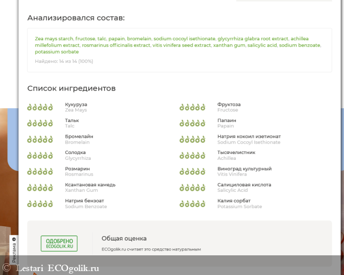 Состав пудры замечательный, все компоненты натуральные, что подтверждает проверка на Экоголик.