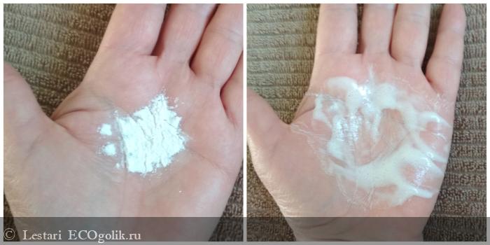Для лица применяю её два раза в неделю, моей возрастной, чувствительной коже этого достаточно. Высыпаю порцию на руку, добавляю воды, перемешиваю, получается консистенция молочка с пенкой. Переношу её на лицо, без фанатизма массирую в течение одной минуты. Смываю водой, удаляется она хорошо и во время смывания сразу ощущаю какая гладкая стала кожа.