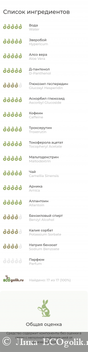 Состав: вода, гидролат зверобоя, гель алоэ вера, Д-пантенол, альфа глюкозил гесперидин, аскорбилгликозид, кофеин, троксерутин, токоферол (витамин Е) , мальтодекстрин, экстракт зелёного чая, экстракт арники, аллантоин, бензиловый спирт, сорбат калия, бензоат натрия, парфюмерная композиция.