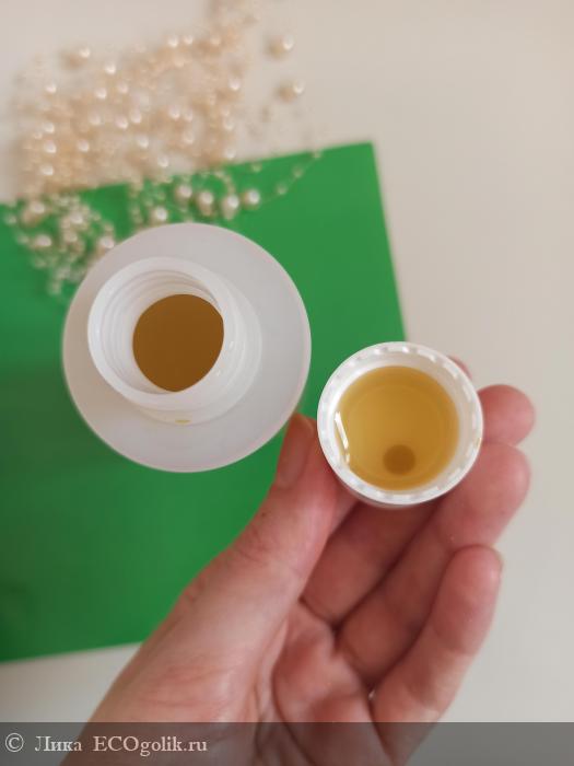Жидкость янтарного цвета и приятного аромата. Запах знакомый, но я никак не могу вспомнить, где его встречала. Это что-то травяное с вкусными нотками, которые я так и не распознала.