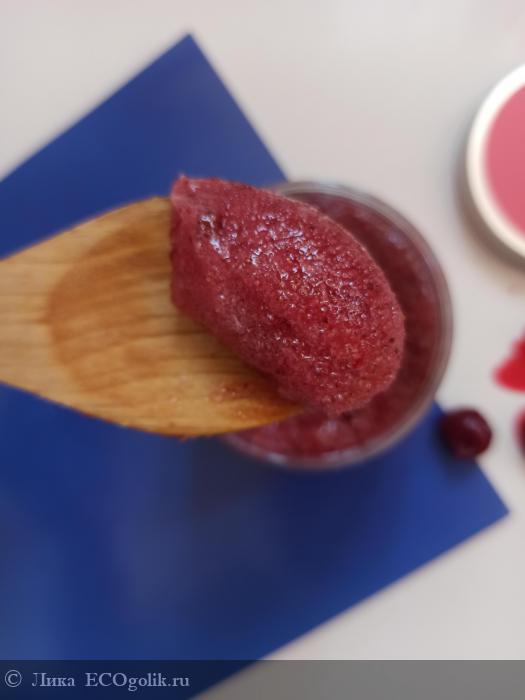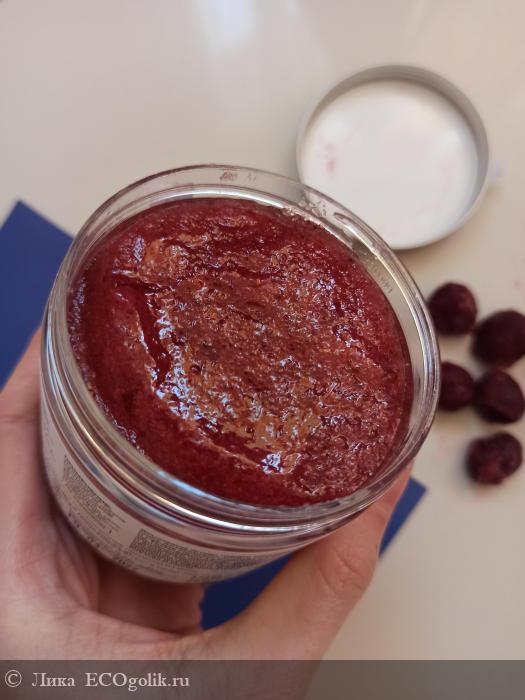 Скраб весьма заманчиво выглядит - красный цвет пробуждает аппетит, а при прочтении слова "вишня" лично у меня возникает слюноотделение.