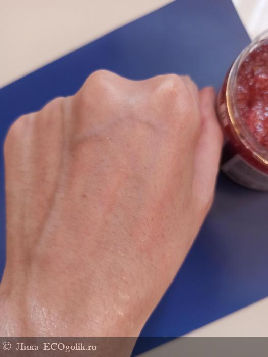 Консистенция вишнёвого варенья скраба тягучая, сахарная и густая! Маслянистости почти не чувствуется. За счёт тягучести за один раз можно вытянуть полбанки средства