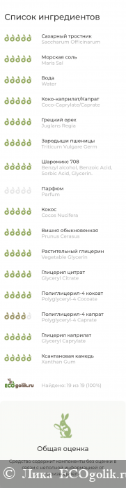 Почти все ингредиенты в составе отличники, без оценки остался только парфюм, производитель утверждает, что ароматизатор пищевой и у меня нет никаких сомнений, т к запах приятный и совсем не "режет" нюх.