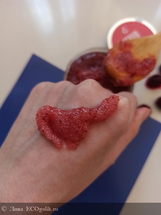 В скрабе присутствует настоящая ягода, ее не только видно, но и слышно! Благоухание умеренное, не тихо и не громко. Пахнет вишней и вишнёвой косточкой с нотками масел, входящих в состав средства. Аромат летний, сладкий и вызывает приятные эмоции, но после смывания скраба на теле не останется...