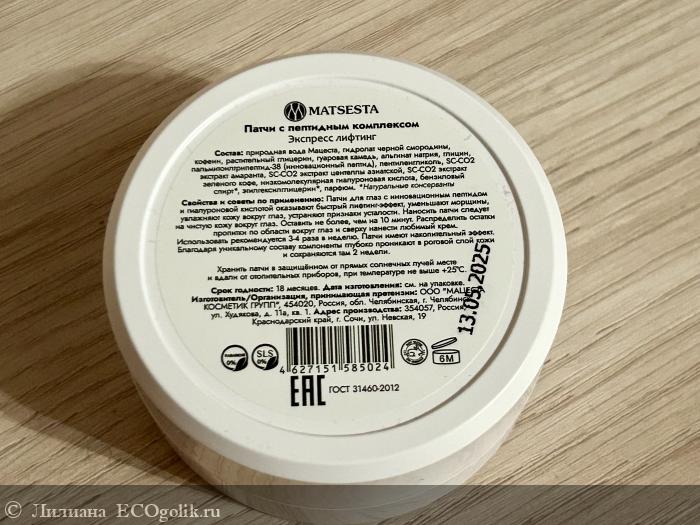Маски нужны не только для лица, но и для области вокруг глаз. Как правило, для этого используют патчи. И, конечно, хочется, чтобы их состав был натуральным, не вызывал плохих реакций, не травмировал кожу под глазами, и без того нежную и притязательную. Натуральные тканевые патчи с эффектом быстрого лифтинга я заказала у бренда Matsesta. Их состав прошел проверку Экоголика на «ура». Поэтому продукт безопасный и подходящий для регулярного использования.