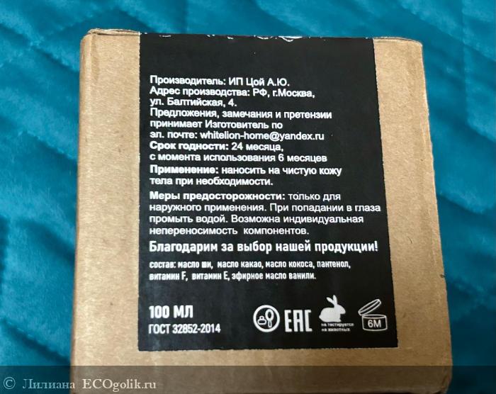 Баттер я заказывала на маркетплейсе, потому что бесплатная и быстрая доставка. Баттер приехал, запечатанным в коробочку, на которой находилась вся нужная информация. Самое главное для меня – чистый состав баттера. Это масла – ши, какао, кокоса. А также пантенол и витамин Е.