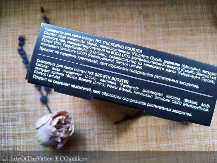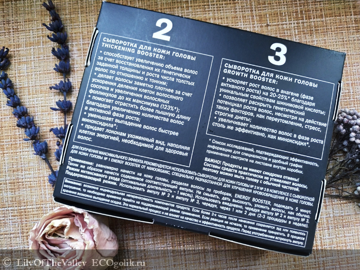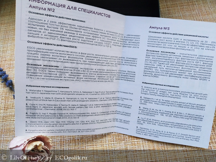 (в среднем волосы отрастают на 2-3 мм в день, а реально оценить происходящую ситуацию с количеством/скоростью роста можно только с микроскопом), хотя средства действительно серьёзные, с рабочим составом и с отсылками на научные исследования в приложенных к набору буклетах!
