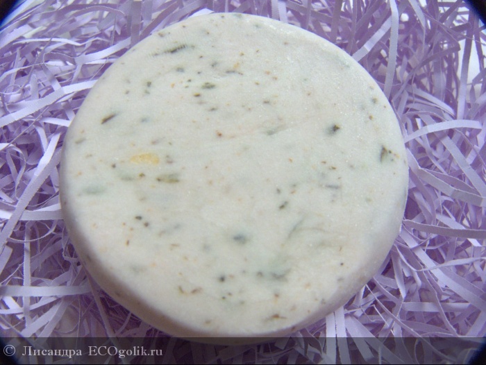 На обратной стороне отчётливо видны частички трав, которые, кажется, не несут никакой функции. Однако, придают шампуню вид настоящего камешка. Симпатично!
