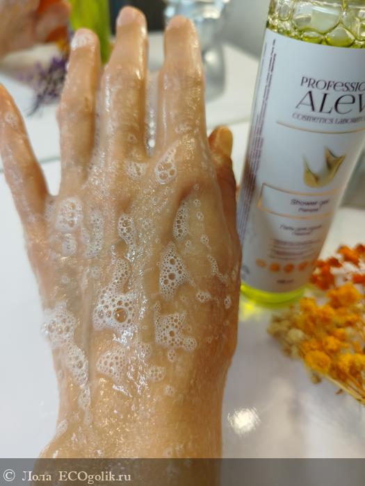 Второй вид нанесения, наношу на мочалку, взбиваю лёгкую пену и принимаю душ, массируя тело лёгкой, нежной пенкой, и также наслаждаюсь класным, бодрящим, освежающим ароматом.