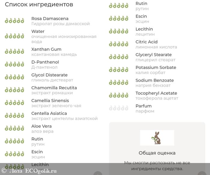Отличный классный состав, мягкие и успокаивающие компоненты, экстракты, природные и натуральные. На первом месте розовая вода, что положительно влияет на деликатное и бережное отношение к коже, д-пантенол, алоэ вера, зелёный чай, деликатно восстанавливают и питают кожу.