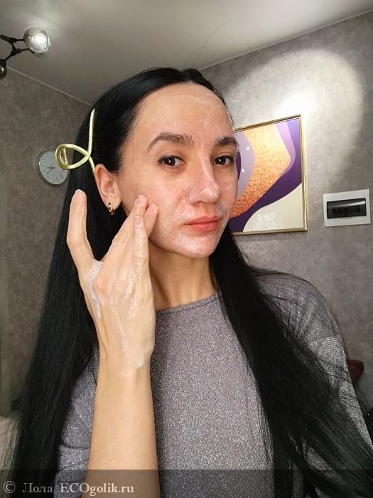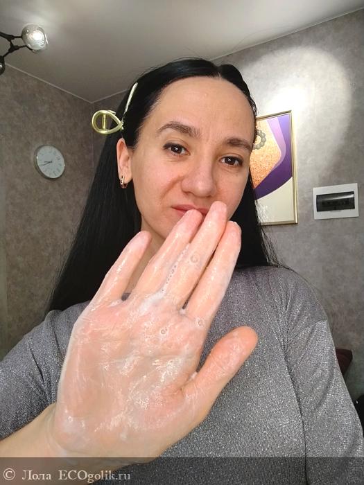 После смешивания с водой мы получаем лёгкую пенку с мельчайшими отшелушивающими частичками, которые дают возможность сделать мега лёгкий деликатный отшелушивающий массаж.
